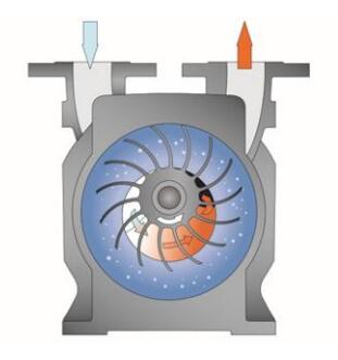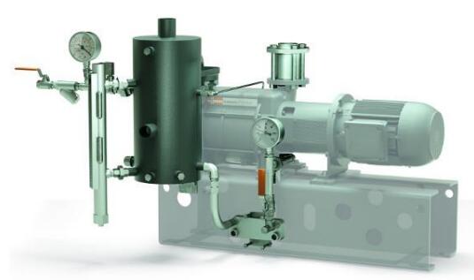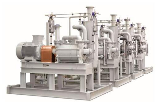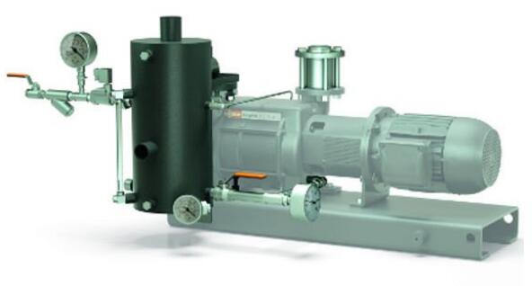 真空技術(shù)從未停止發(fā)展——不僅是在近些年,數(shù)十年來真空技術(shù)一直在不斷發(fā)展。如今,干式螺桿真空泵被應(yīng)用于化工技術(shù),而在其它應(yīng)用領(lǐng)域,爪型干式真空泵已成為常規(guī)的真空泵。油潤滑旋片真空泵也在多種應(yīng)用領(lǐng)域中體現(xiàn)著它的最先進(jìn)技術(shù),原因在于其仍然在不斷發(fā)展。在諸多應(yīng)用領(lǐng)域,這些真空泵通常為最常用的真空泵。盡管真空泵在技術(shù)上有諸多改進(jìn)、新發(fā)展以及進(jìn)一步提升,然而在某些應(yīng)用中,真空產(chǎn)生的原理之一——液環(huán)真空泵仍沿用至今并依然卓有成效。 圖1: Dolphin液環(huán)真空泵的兩種版本,抽速可用范圍從25到26,800立方米每小時(shí) 液環(huán)真空泵的原理早在1890年就有研究,即"水環(huán)泵"。由于其結(jié)構(gòu)簡單而堅(jiān)固,液環(huán)真空泵(圖1)適用于抽除潮濕氣體或蒸汽,或者被抽氣體在真空泵內(nèi)部的壓縮過程中發(fā)生冷凝的應(yīng)用中。液環(huán)真空泵特別適用于潮濕的工藝和粗真空的工藝技術(shù),諸如化學(xué)工業(yè)和石油生產(chǎn)和加工、汽輪機(jī)凝汽器抽真空以及塑料工業(yè)、造紙業(yè)、食品工業(yè)和多種其他工業(yè)應(yīng)用。 工作原理 液環(huán)真空泵的工作液可以使用水或與被抽氣體或蒸汽相容的液體作為工作液。乙二醇、礦物油或有機(jī)溶劑,以及工藝流程中使用到的液體可用作泵的工作液。不同規(guī)格大小和版本的泵,其基本原理是相同的。 圖2: Dolphin液環(huán)真空泵壓縮腔室的剖面圖 偏心安裝的葉輪在圓柱形泵殼(圖2)中旋轉(zhuǎn)。向泵殼灌注工作液,使葉輪葉片浸沒在工作液中。葉輪旋轉(zhuǎn)和隨之產(chǎn)生的離心力使泵殼內(nèi)的液體形成所謂的液環(huán)。氣體被抽入到泵送的介質(zhì)被傳輸?shù)饺~片和液環(huán)之間的空間內(nèi)。葉輪的偏心旋轉(zhuǎn)改變了這些空間的容積,借此吸入、壓縮并排出氣體。液環(huán)將各級空間密封為泵腔。因此,該液體有時(shí)候被稱為密封液,而不是工作液。 機(jī)理 基于所使用的工作液,該機(jī)理僅能在粗真空范圍內(nèi)使用。這是因?yàn)榭蛇_(dá)到的真空度取決于通過真空泵不斷抽送的工作液的蒸汽壓和黏度。這個(gè)要求液環(huán)真空泵需要在相對較低的溫度下運(yùn)行,同時(shí)由于是等溫運(yùn)行,這意味著被抽介質(zhì)在泵的壓縮過程中不會被升溫。因此,液環(huán)真空泵特別適合用于抽除含濕度高的蒸汽和氣體。真空泵內(nèi)的低溫有利于被抽蒸汽的冷凝。在一定程度上,這意味著真空泵還可以作為冷凝器使用,由于混合物進(jìn)入真空泵時(shí)會發(fā)生冷凝,大大縮小了被抽氣體的體積。除了冷凝效果,還提高了額定抽速。 工作液轉(zhuǎn)移壓縮熱量,即支持冷凝和提高抽速的過程。液環(huán)真空泵的一大顯著優(yōu)點(diǎn)在于:組件所用材料和工作液可根據(jù)泵送介質(zhì)進(jìn)行調(diào)整。這使其可以抽除腐蝕性氣體或易爆氣體以及蒸汽。由于運(yùn)行溫度低,因此相比使用其他機(jī)械真空泵,在所有情況下均認(rèn)為液環(huán)真空泵抽除易爆物質(zhì)所產(chǎn)生的問題更少。 結(jié)構(gòu) 單級液環(huán)真空泵和雙級液環(huán)真空泵之間有著根本區(qū)別。在單級液環(huán)真空泵中,在一個(gè)壓縮階段內(nèi)執(zhí)行上述壓縮流程。而在雙級真空泵中(圖3),第一階段預(yù)壓縮的泵送介質(zhì)被輸送到第二壓縮階段并再次壓縮。單級液環(huán)真空泵可實(shí)現(xiàn)130hPa (mbar) 的極限壓力,雙級液環(huán)真空泵可達(dá)到最高33hPa (mbar) 的極限壓力。 圖3: 通過雙級液環(huán)真空泵的氣流 結(jié)構(gòu)尺寸也有明顯差異。在Dolphin液環(huán)真空泵產(chǎn)品組合中,普旭(Busch)真空泵和真空系統(tǒng)擁有不同產(chǎn)品系列和版本,抽氣速率從25到26,800立方米每小時(shí)不等。 運(yùn)行方式 泵的工作液的進(jìn)和出可通過三種方式實(shí)現(xiàn): 1. 流體非再循環(huán)運(yùn)行 這是運(yùn)行液環(huán)真空泵的最簡單方式,在工作液足夠時(shí)均可用。持續(xù)不斷地為泵的壓縮腔提供工作液,然后工作液與氣體和冷凝水一起排出泵體。 2. 開放式流體回路 在開放式回路中(圖4),工作液流出真空泵后與氣體一起被排到液體分離器中,液體和氣體在此分離,當(dāng)氣體被排出液體分離器的同時(shí),新的工作液會補(bǔ)充進(jìn)入液體分離器。通過液體分離器,向回路供應(yīng)補(bǔ)充的全新工作液。這保證了回路中有充足的工作液,且溫度不會上升。與非循環(huán)運(yùn)行模式相比,開放式回路可節(jié)省多達(dá) 50% 的工作液。 圖4: 工作液局部循環(huán)系統(tǒng)的 Dolphin 液環(huán)真空泵 3. 閉合式流體回路 閉合式回路中在真空泵的排氣口也設(shè)有液體分離器(圖5)。氣體從分離器排出,同時(shí)在工作液再次進(jìn)入真空泵之前先經(jīng)過熱交換器,這樣,工作液可以得到不斷冷卻。這種配置可節(jié)省95%的工作液。這意味著只有少量新鮮工作液需要通過液體分離器進(jìn)行添加。因此,在沒有足夠工作液的情況下,或者需要盡可能節(jié)省工作液時(shí),我們建議使用閉合式回路。 圖5: 工作液整體循環(huán)系統(tǒng)的 Dolphin 液環(huán)真空泵 量身定制的